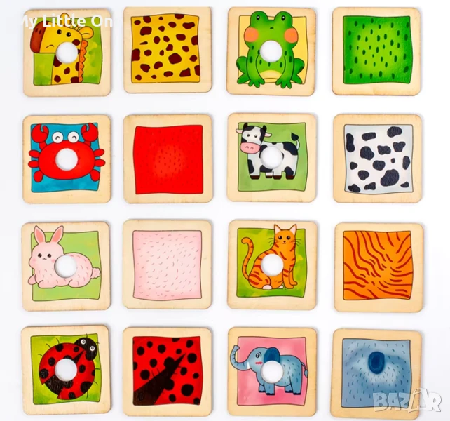 Смесете всички дървени части, след това извадете карта от перфорираните и оставете детето да идентифицира картата, която илюстрира кожата или козината на съответното животно, като така образува 24 двойки.