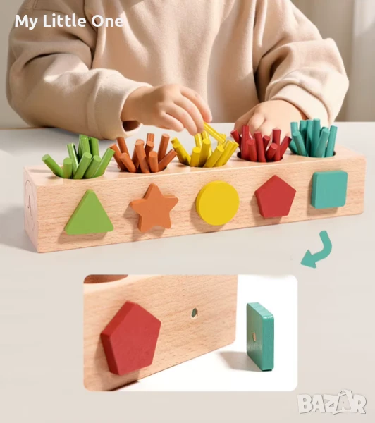 Тази играчка е идеална и за изучаване на цветове, с цветни форми отпред за идентифициране и съпоставяне на пръчките.