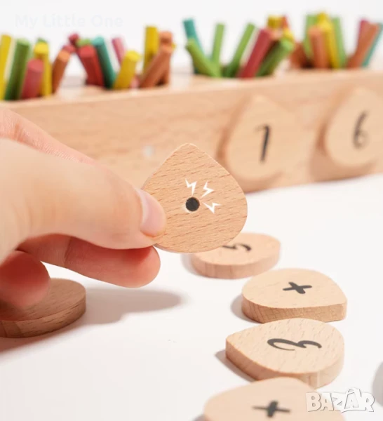Освен това в горната част на играчката има определени места за поставяне на пръчките според числата, насърчавайки развитието на двигателната координация и уменията за броене. И това не спира дотук!