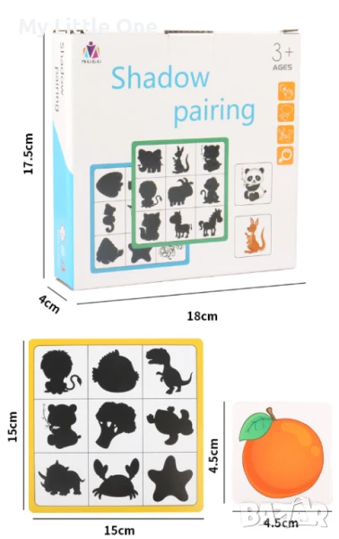 Картонените листове, отпечатани със сенките на обектите, са свързани с красиво илюстрираните дървени части на предметите. Играта със сенки развива асоциациите, координацията око-ръка, вниманието, мисленето, проницателността, зрителния и тактилен усет, както и търпението.