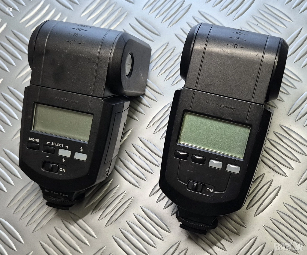 LCD дисплей: Разполага с индигово осветен LCD дисплей, който показва режим на светкавицата, компенсация на експозицията, скорост на филма/честота на стробоскопа, обхват, настройка на зума, бленда и ръчна мощност.