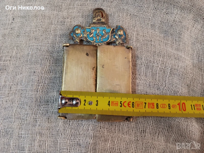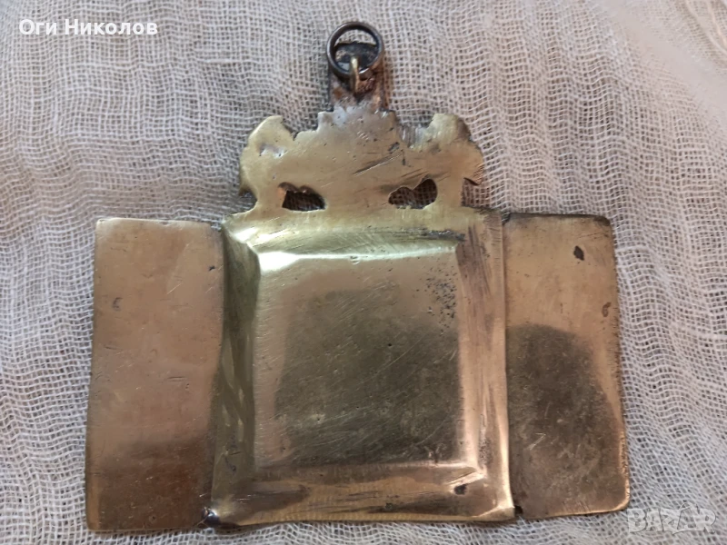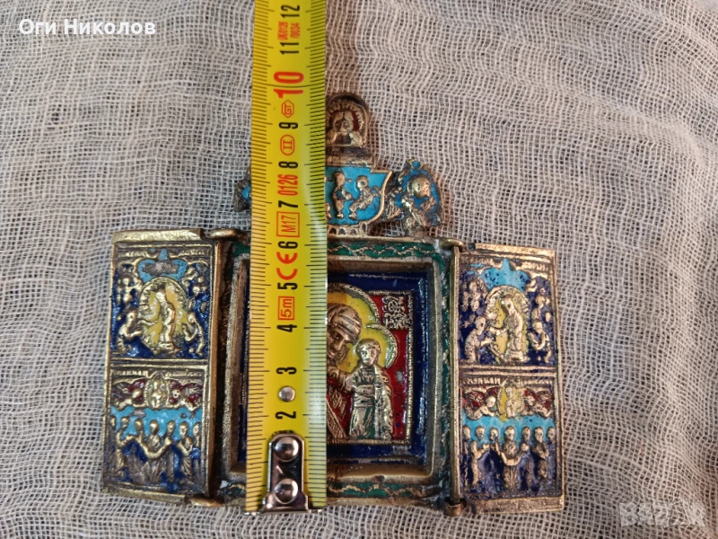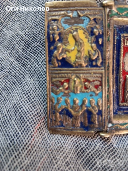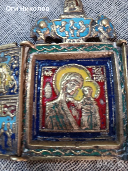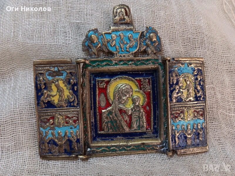 Старинна руска царска икона-триптих от XIX век. Изработена от бронз и емайл.Отлично състояние. Размери в прибрано състояние - 10 х 6 см. Размери в разгънато състояние - 10 х 11 см.