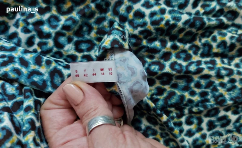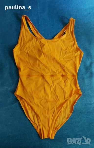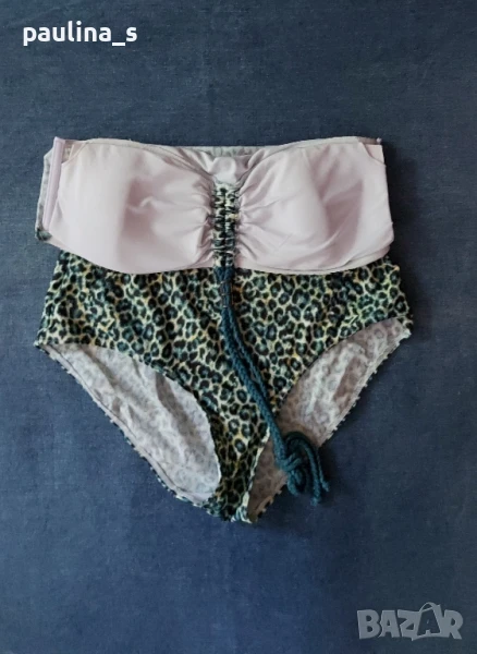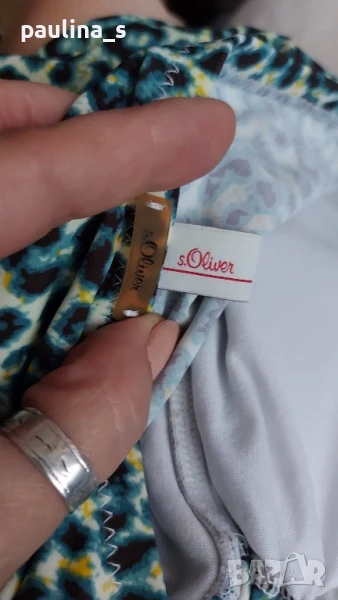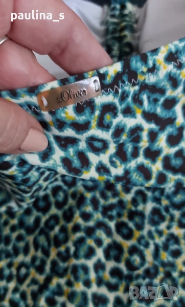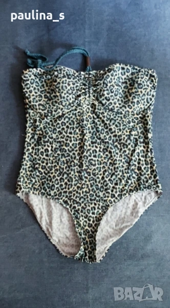 2️⃣. L / 2XL - "S'Oliver". Цената е крайна 39,99лв / 20 евро. Зелен леопардов принт! Цял бански с подплънки, странични банели и шнур за врата от средата на бюста, чашката отговаря на С. По етикет е 40EU, но е уголемен и може да се носи от 42EU, дори от 44EU. Никога не е ползван, отлично състояние видимо от снимките. Оранжевият цял бански "Hema" е с разхлабени от съхранението ластици и е подарък, ако някой купи другия.