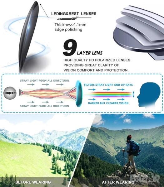 Тези слънчеви очила са идеални за спорт и колоездене, шофиране, бягане, риболов, сърф, колоездене, бейзбол, голф, катерене, приключения, трекинг, мотоциклетизъм, мъже и жени или други ентусиасти на дейности на открито, подходящи са и като моден аксесоар и за ежедневно носене през цялата година.
