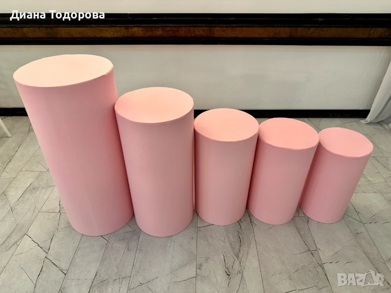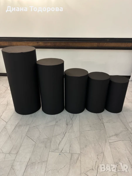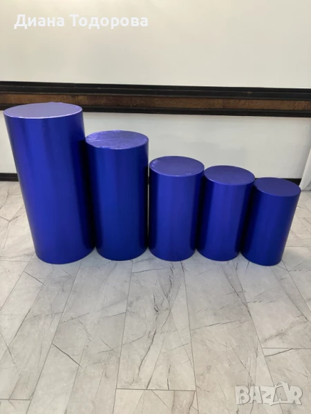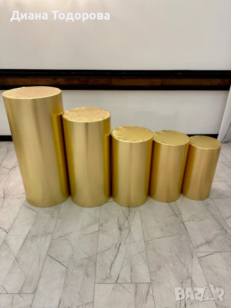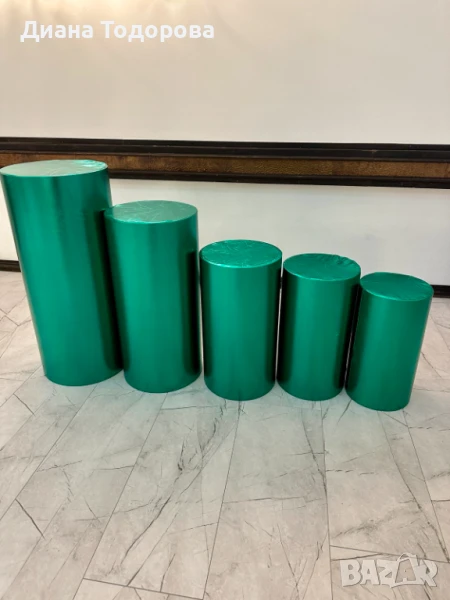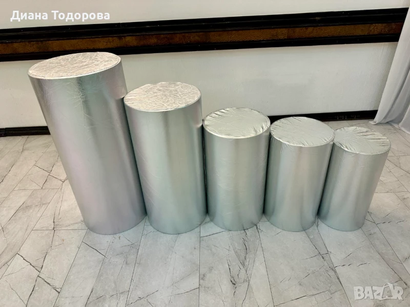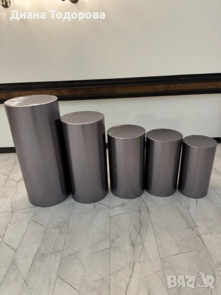 Метални цилиндрични колони 5 броя в комплект, бели, кухи и леки, за интериорна и екстериорна декорация. Колоните влизат една в друга и са удобни за транспортиране. Цена на к-т от 5 бр: 550 лв.