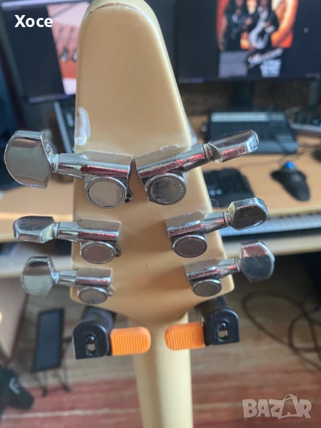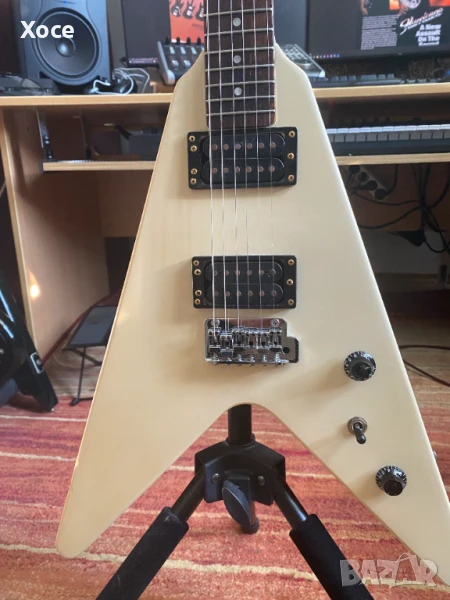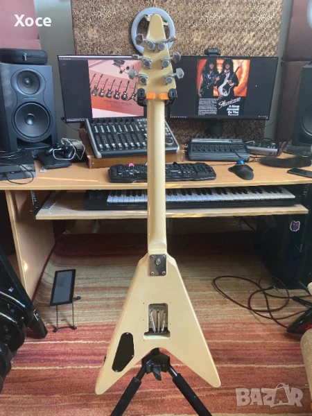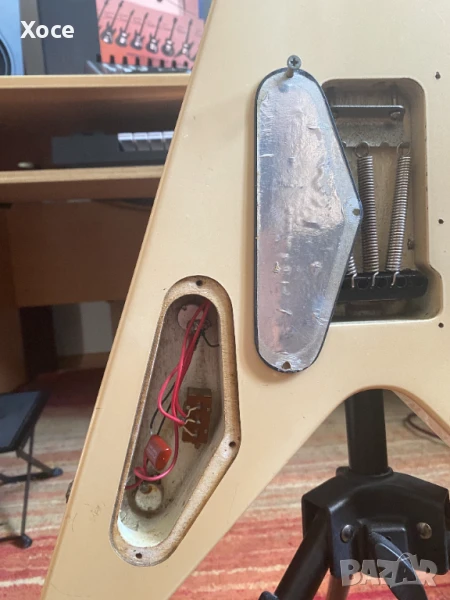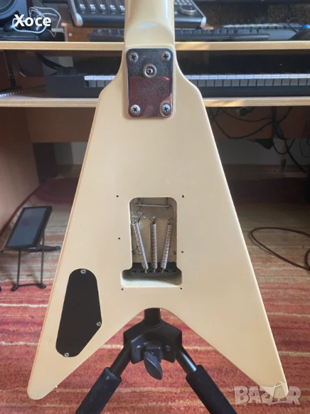 This iconic Flying V-shaped guitar is lightweight with great sustain and resonance. Its high-output pickups (unmarked but powerful) deliver a punchy tone. All electronics work perfectly, and the truss rod has adjustment room remaining. Missing parts: Tremolo arm and back plastic plate.