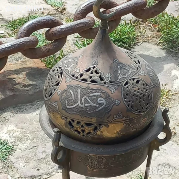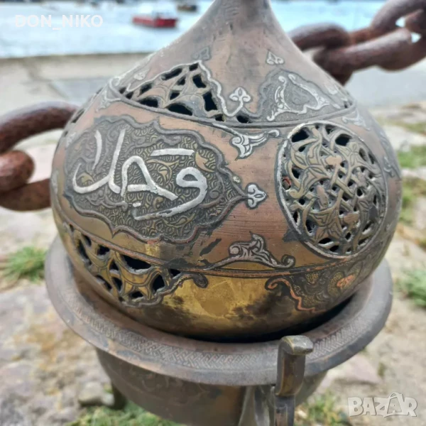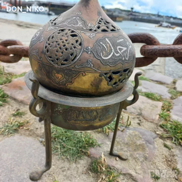 Ислямски (Отомански) съд за Благовонни масла 19 век без забележки.Инкрустиран с арабска калиграфия и ислямски мотиви по цялата повърхност.Изключителна изработка, с финни детайли.Щамповани сребърни и медни орнаменти и повтарящи се геометрични шарки.Основата има широк ръб, който също е силно орнаментиран с преплетени сребърни и бронзови орнаменти.Размери: 37 см височина,18 см диаметър на съда.