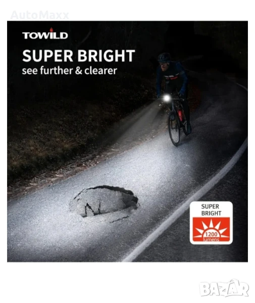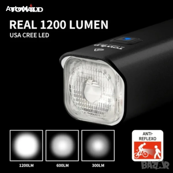 Челник за колело TOWILD CL1200, 1200 лумена, батерия 5000 mAh, закрепване към кормилото, водоустойчивост IPX-6, 176 г.Закупен от Amazon Германия,изпращам с преглед и тест задължително!