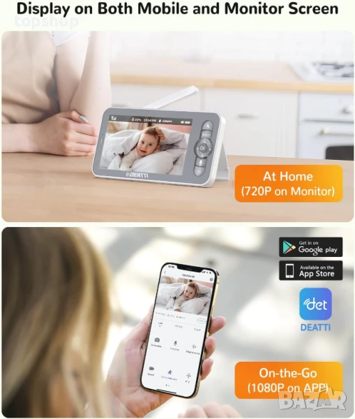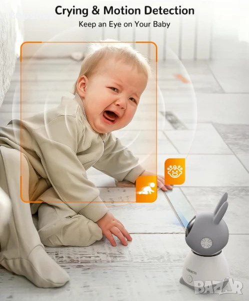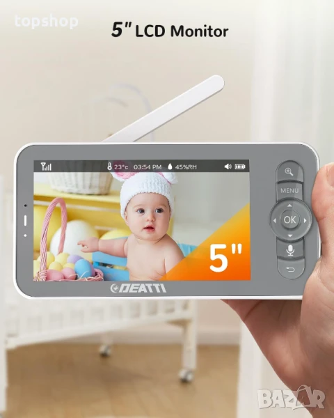 НОВ, ТЕСТВАН бебефон DEATTI с камера, WiFi видео бебефон, 5-инчов дисплей, управление чрез приложение, детекция на плач/движение/шум, PTZ, IR нощно виждане, двупосочно аудио, приспивни песни, 1080P