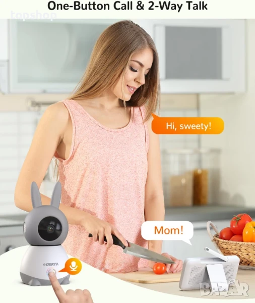 Двупосочен разговор и повикване с един бутон: Понякога бебето ви просто трябва да чуе звука на гласа ви. Успокойте детето си от всяка стая с вградения интерком на преносимото родителско устройство. Този видеобебефон използва технология за двупосочен разговор, за да улесни онлайн комуникацията с вашето бебе от разстояние.