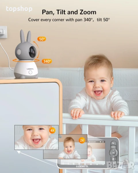 Бебефон DEATTI 200 метра обхват, 5-инчов дисплей, управление чрез приложение PTZ, двупосочно аудио..