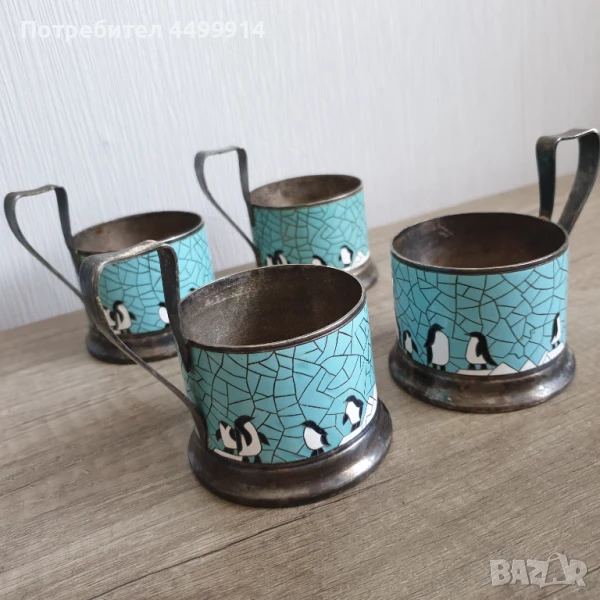 Руски поставки за чаши с дизайн на пингвин, СССР, емайлирани, бронзови, посребрени- 4 броя..Вътрешният размер е 65 мм ширина и 40 мм дълбочина.