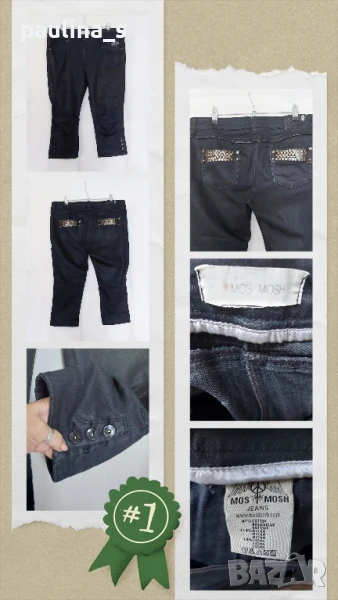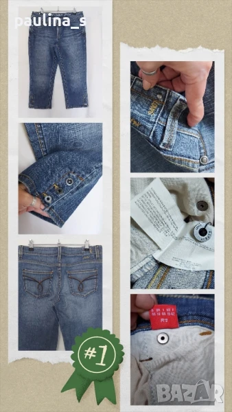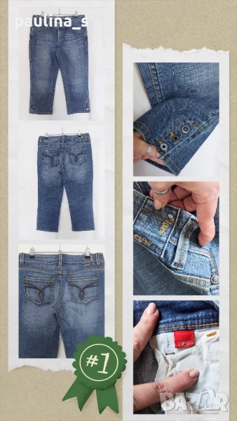 1️⃣. Колаж / M / XL - "Esprit". Цената е крайна 24,99лв / 12,5 евро. ВИНТИДЖ! Дамски маркови дънкови бермуди, модел 5 pocket Denim, дължина 7/8, имат ефективни цепки на крачолите. Моделът е с леко ниска талия, качеството на изработката и самата дреха са ниво, бродирано лого и емблема, брандирани копче и кабси. Вече не се произвеждат дрехи с такова качество! Платът е плътен Деним с еластичност, покрива няколко размера. Като нови!
