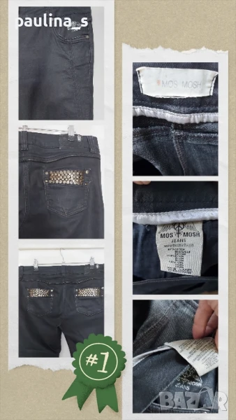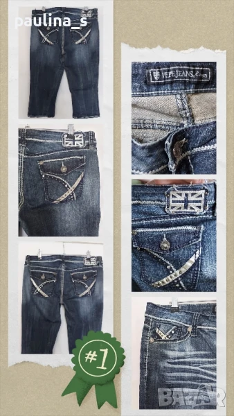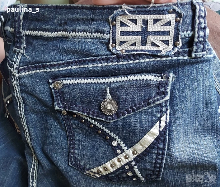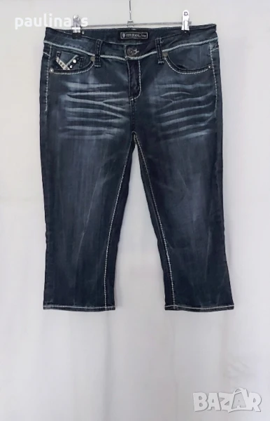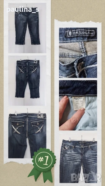 3️⃣. Колаж / L / 2XL - "Pepe Jeans"original. Цената е крайна 59,99лв / 30 евро. ВИНТИДЖ! Дамски маркови еластични дънкови бермуди Pepe jeans. Моделът е с леко ниска талия, богато декориран 5 pocket Denim с избелващ ефект, дебели маркировъчни тегели, камъни и бродерии. Десенът преминава от индиго на места до черно double coloured - двуцветен ефект. Кабсите и копчетата са с камъни, джобовете отзад са с капаци. Изумителни, една бройка, не са чисто нови, но са без дефекти, като нови.