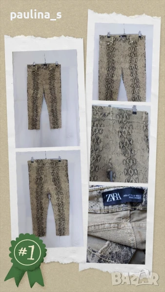 4️⃣. Колаж / М / 2XL - "Zara". Цената е крайна 29,99лв / 15 евро. НОВИ! Еластични дънкови бермуди в змийски принт, с непоръбени крачоли. Моделът е 5 pocket Denim standard, с дължина 7/8, нормална талия и голяма еластичност. Може да се носят до 44EU. Нови са, никога не са ползвани, без дефекти и етикет.