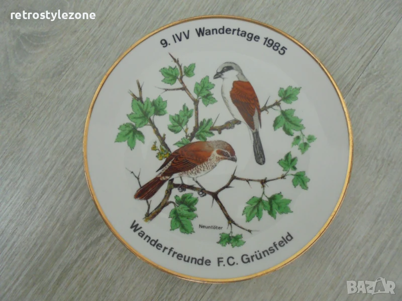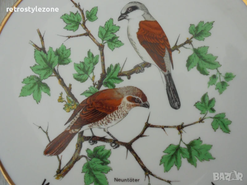 декоративна порцеланова чиния с диаметър 19 см от висококачествен немски порцелан. Изобразени са две красиви птици – „Neuntöter“ (Червеногръд свирач).
