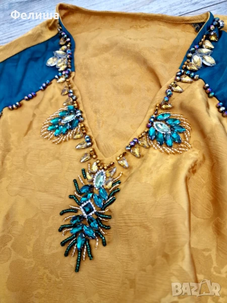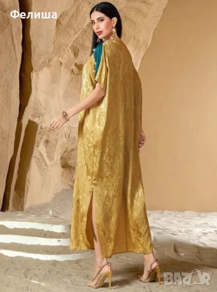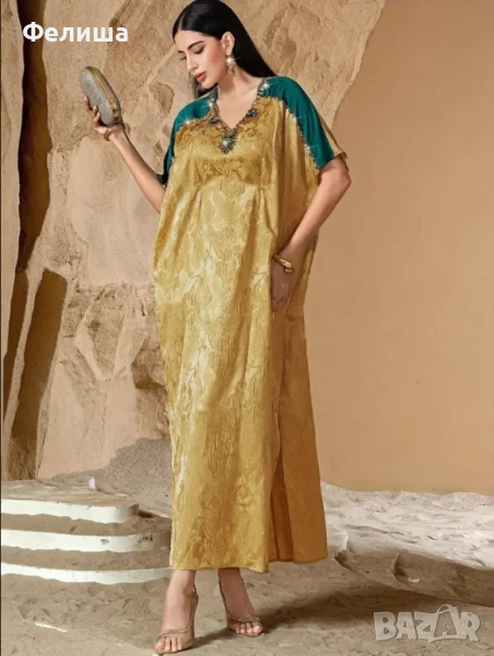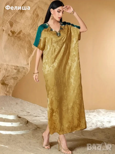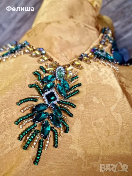 Лимитирана Арабска Жакард Златна Рокля с Инкрустирани Зелени Изумрудени Камъчета и Блестящи Мъниста → Обява 51006223