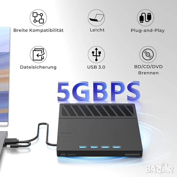 9-в-1 USB хъб: това 9-в-1 външно Blu-ray устройство предлага разнообразни функции. 1 USB 3.0 порт, 3 USB 2.0 порта, 1 TF слот, 1 слот за SD карта. Поддържа четене на BD/DVD/CD дискове и запис на DVD/CD дискове. Не поддържа обаче запис на BD дискове. Можете лесно да копирате музика, филми и файлове с данни от SD карти, TF карти или чрез USB портовете на вашия компютър. Можете също да прехвърляте файлове от Blu-ray плейър на SD карта или USB твърд диск. Съвместим с USB твърд диск, мишка и клавиатура със или без кабел, компютърен радиатор и други USB компютърни аксесоари.