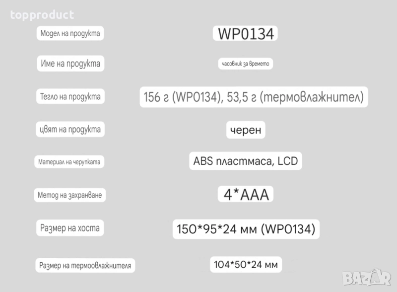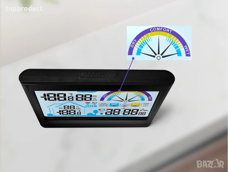 Показва час, вътрешна и външна температура и влажност.