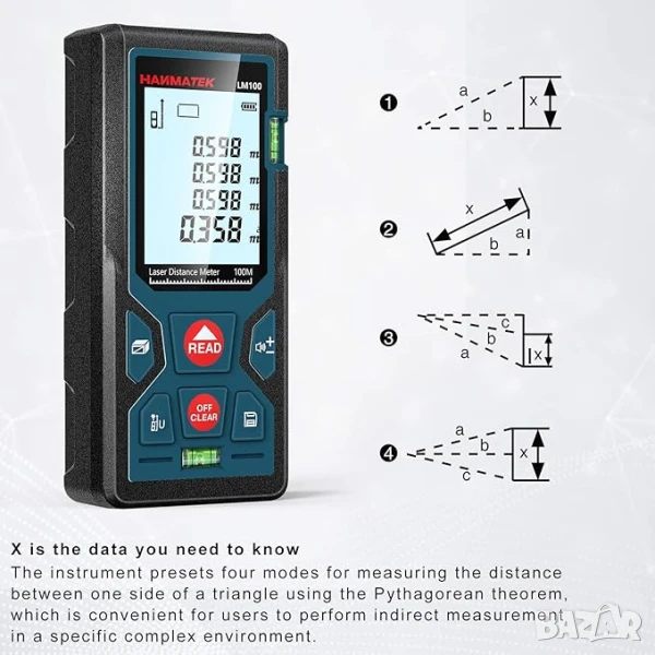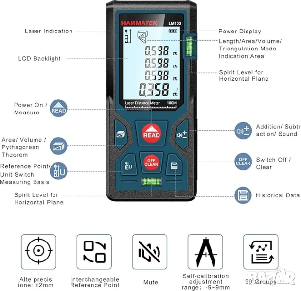 Цифров Лазерен Далекомер HANMATEK до 100м с 2 нивелира LCD дисплей