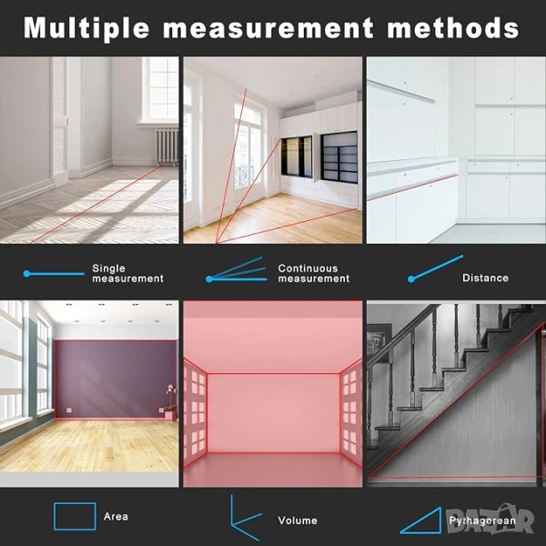 Площ, разстояние, дължина, обем, непрекъснато измерване, питагоров метод - три точки; Събиране и изваждане; Индикатор за изтощена батерия; 99 групи данни в паметта; Ръчно изтриване на данни; Автоматично изключване след 150 секунди без работа за пестене на електроенергия.
