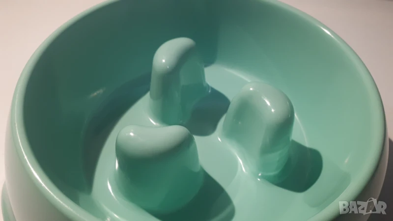 Купата се ползва, когато кучето яде прекалено бързо. Издутините вътре в купичката създават препятствие за кучето, така че да не може да си напълни устата с голямо количество храна навежнъж. Пластмата е доста качествена. Има гума отдолу против хлъзгане. Издутините са заоблени.