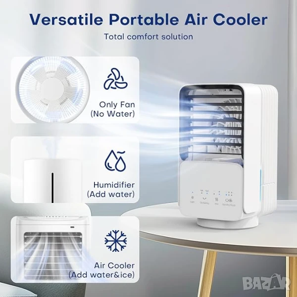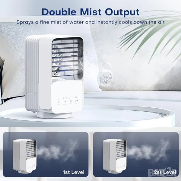охладител и овлажнител използва ултразвукова технология за разпръскване на вода във фина мъгла, която след това се разпределя от вентилатора и осигурява хладен и влажен въздух. Можете да избирате от различни режими на разпръскване, за да увеличите влажността и по този начин ефективно да облекчите неудобството, причинено от лятната сухота.