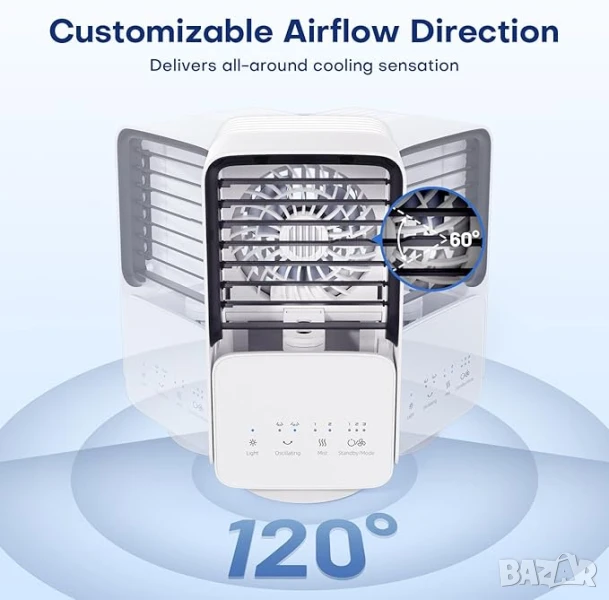 Въртящите се лопатки на мобилния овлажнител могат да се регулират нагоре и надолу до 60°, за да се регулира гъвкаво посоката на въздушния поток. Освен това, функцията за въртене на 60°/120° увеличава площта на покритие за хладен въздух и избягва неудобствата, причинени от продължителен едностранен въздушен поток.