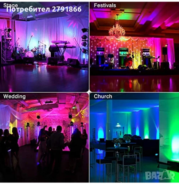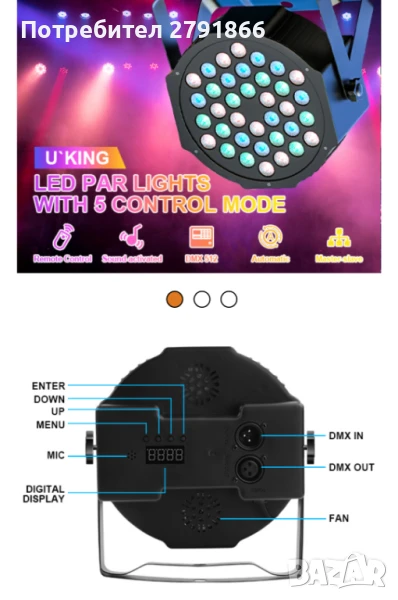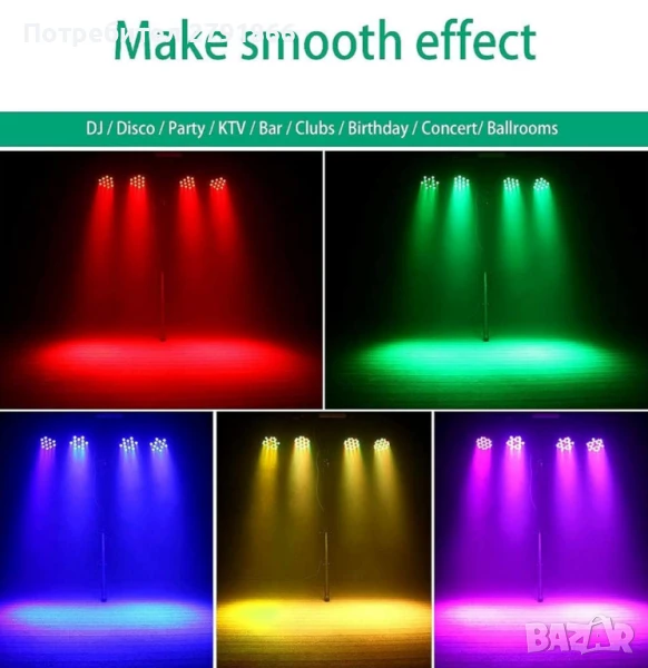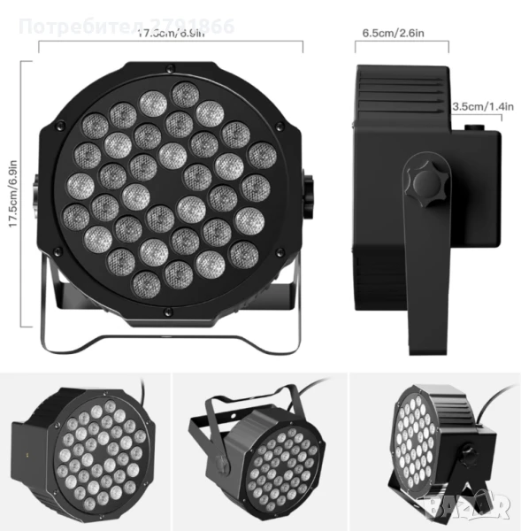 - Множество режими на работа: Сценичното осветление е съставено от 36 LED лампички. Има 7 режима на работа: статичен цвят, стробоскоп, автоматичен, гласово управление, master-slave, DMX, градиентен режим. Ултрависока яркост, стабилна, ниска консумация на енергия.