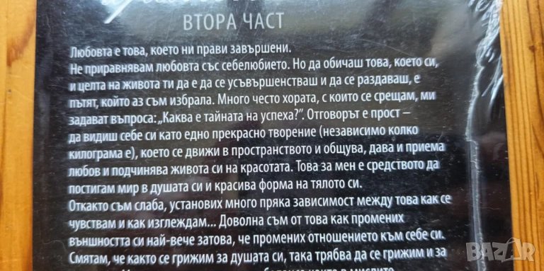 Не приравнявам любовта със себелюбието. Но да обичаш това, което си, и целта на живота ти да е да се усъвършенстваш и да се раздаваш, е пътят, който аз съм избрала. Много често хората, с които се срещам, ми задават въпроса: „Каква е тайната на успеха?”. Отговорът е прост – да видиш себе си като едно прекрасно творение (независимо колко килограма е), което се движи в пространството и общува, дава и приема любов и подчинява живота си на красотата. Това за мен е средството да постигам мир в душата си и красива форма на тялото си.