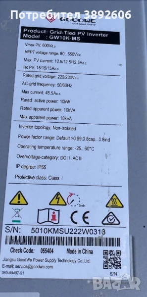 🟢 ПРОДАВАМ Соларен инвертор GOODWE GW10K-MS – 10kW Трифазен + Smart Meter + модул → Обява 51009583