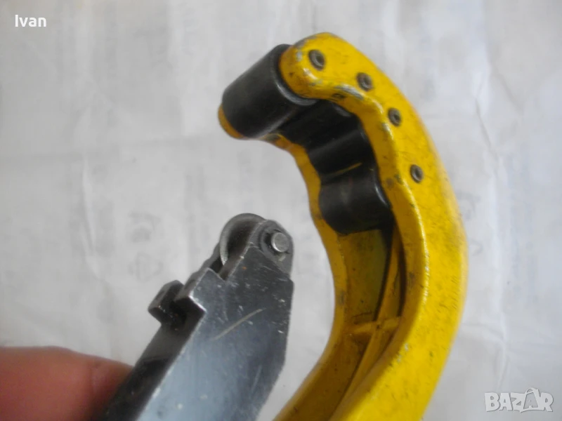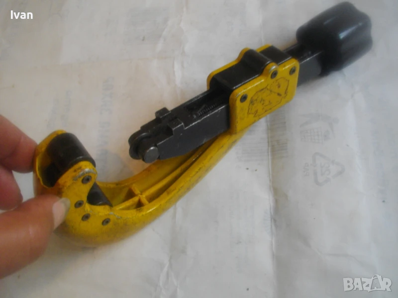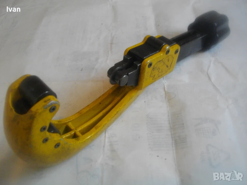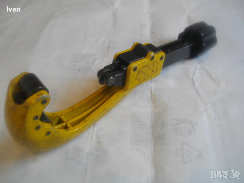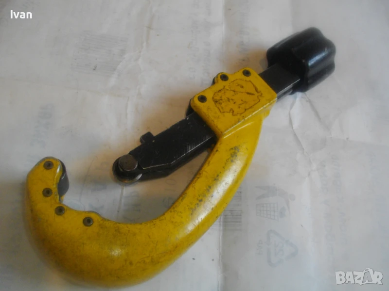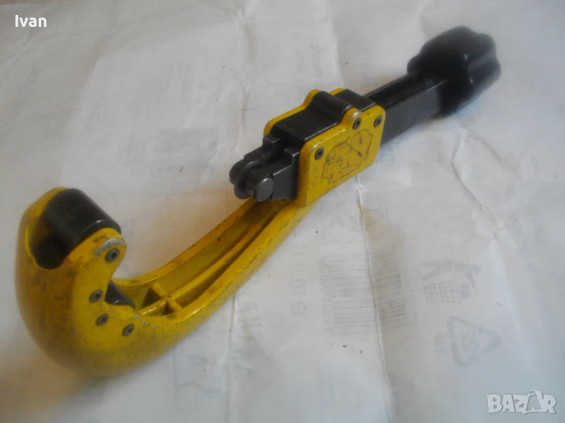 тръборез. Марка и модел - REMS Ras Cu-INOX за рязане на медни, тънкостенни неръждаеми, алуминиеви тръби с дебелина да стената до 4 мм. Инструмента е за тежки натоварвания. Професионален. Капацит на рязане тръба - диаметър ф 6 мм - ф 64 мм. Тръбореза е със запазен външен вид и отлично техническо/работно съсотяние. Без забележки. Резеца е без никакви наранявания. От инструментална закалена стомана е. Магазинната цена на модела тръборез към август 2023 г. в България е 421 лв.