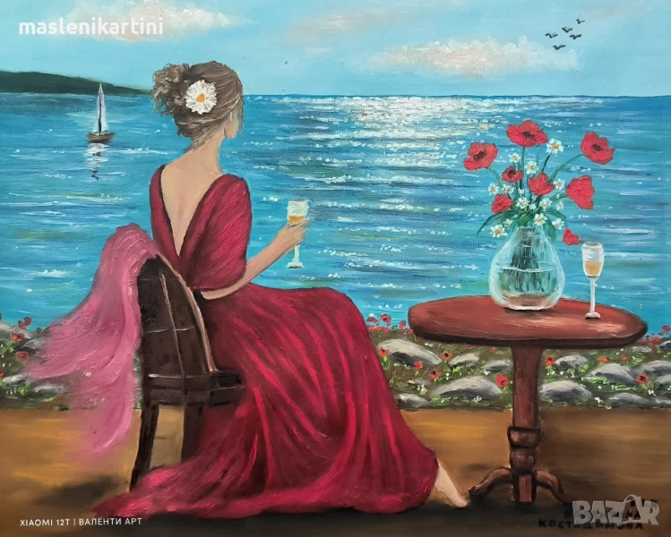 Жена с червена рокля край морето маслена картина → Обява 51011903