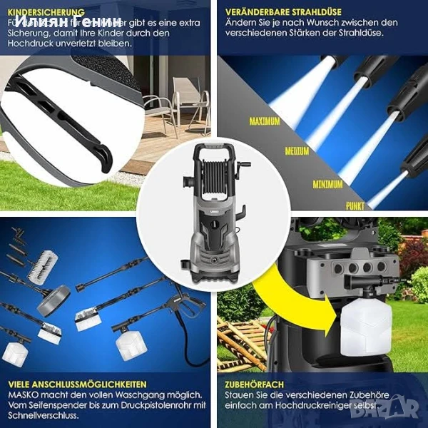 Използвайте различните приставки за прецизно отстраняване на мръсотия. За употреба върху вътрешни дворове, скари, тръби и различни повърхности като плочки, метал, камък, дърво, мебели и автомобили с дозатор за сапун и пръскачка за пяна. Приставките за високо налягане ви позволяват също така да регулирате оптимално силата на пръскане.