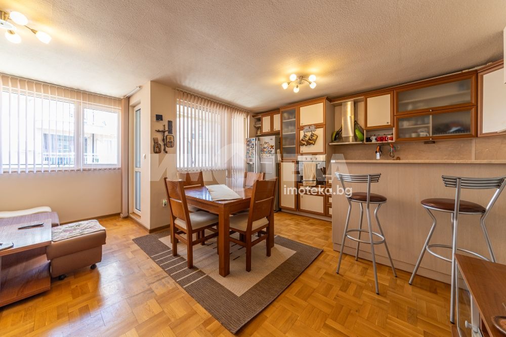 Прекрасен тристаен апартамент с чиста площ 96,20 кв.м. Голяма просторна дневна, две спални, две санитарни, перално помещение, килер и мазе 13 кв.м. Апартаментът се продава с цялото обзавеждане и оборудване.