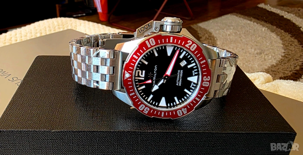 Много сериозно и интересно изпълнение. На пръв поглед предлага класически вид на часовник в стоманена каса, с черен циферблат и бели стрелки. Минутната е с черве кунтур.Но веднага се забелязва, че въобще не е така и не само заради нетрадиционният , масивен лок механизъм на коронката.