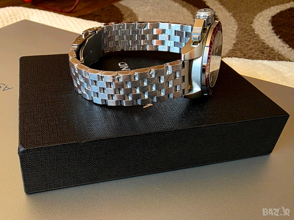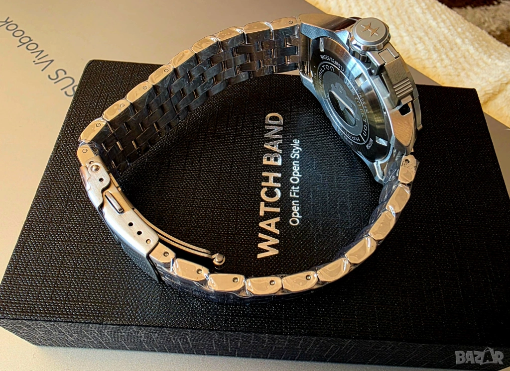 Отчетливи, бели стрелки с полирани кантове и в синя луминисценция . Черен цифер, сапфир с антирефлекс, уникално се вижда през него- все едно няма стъкло. Има лек много приятен, ненатрапчив sunburst ефект.