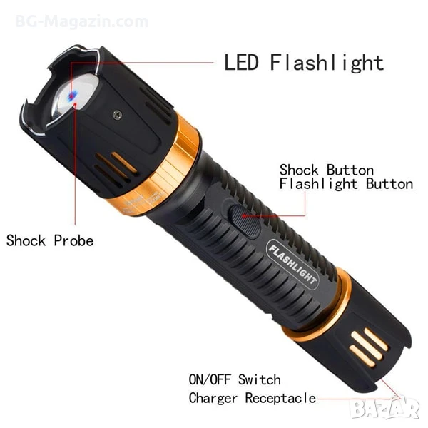 – Многофункционален: комбинира електрошок, фенер и стробоскоп в едно устройство.