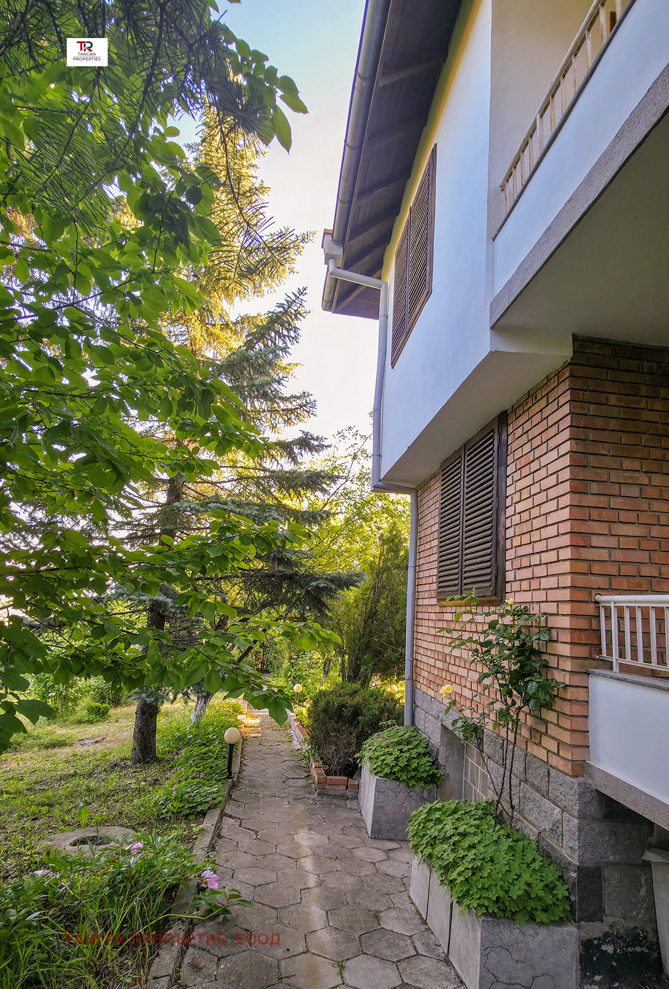 Просторен и красиво озеленен терен с разнообразни дървета и декоративна растителност, оформен с живописни алеи и градинско осветление.