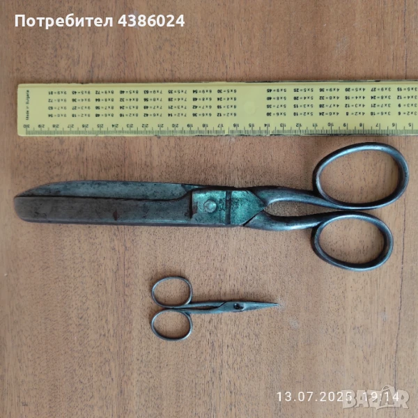 АНТИКВАРНА НОЖИЦА ШИВАШКА ЗА КРОЕНЕ НА ПОНЕ 110 ГОДИНИ. БЕШЕ НА БАБА МИ. РЪЧНО ИЗКОВАНА. РАЗМЕРИТЕ СА СНИМАНИ. БЕЗ ЗАБЕЛЕЖКИ.