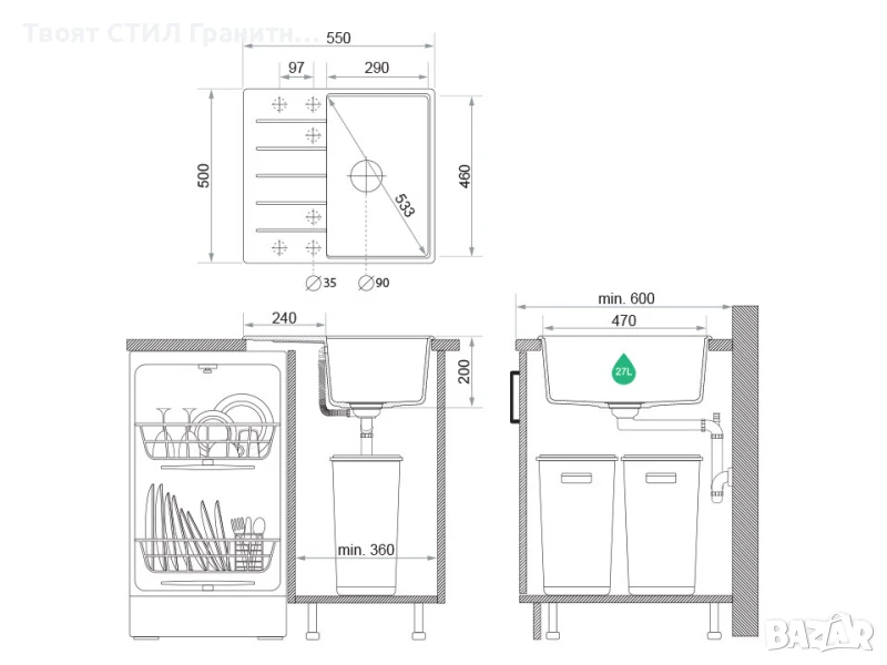 Зелената линия показва необходимото пространство в мм за монтаж на мивката в шкафа !!!