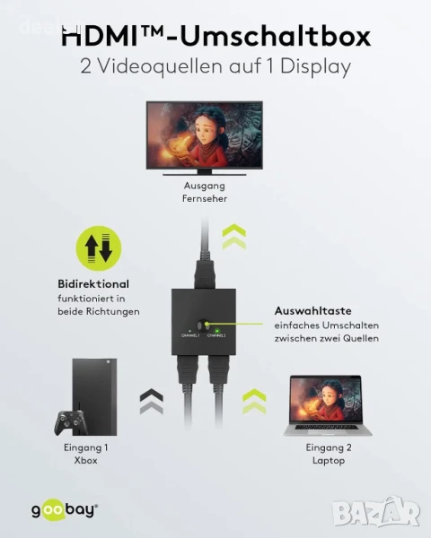 – Goobay HDMI превключвател 2-в-1 с поддръжка на 4K при 30Hz и 3D видео.