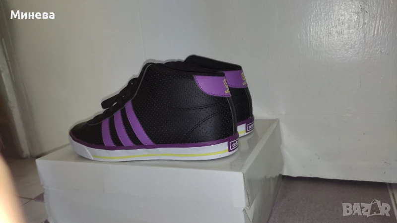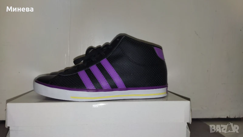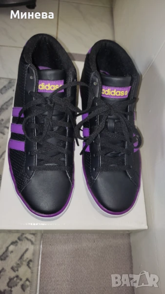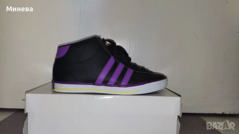 Маратонки кецове Adidas в класическо черно и бяло с лилав нюанс в логото на марката, изработени от висококачествена кожа за отличен комфорт при носене, с равна подметка за повече стабилност при ходене. Номер 38,5 и дължина на стелката 24 см.