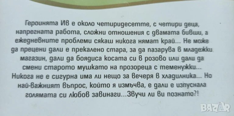 Запознайте се с Ив: четири деца, напрегната работа, сложни отношения с двамата бивши, а ежедневните проблеми не са един и два. На всичкото отгоре не знае дали сексът с ветеринарния лекар е по-добре от никакъв секс; не може да прецени дали е прекалено стара, за да пазарува в младежки магазини и да боядисва косата си в розово. Дали да смени старото мушкато на прозореца с теменужки? А дали в хладилника има нещо за вечеря? Но най-важният въпрос, който я измъчва, е дали не е изпуснала голямата си любов завинаги.