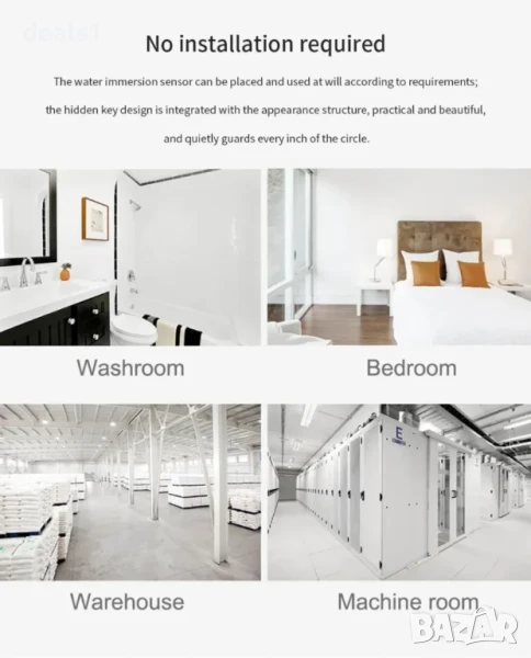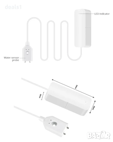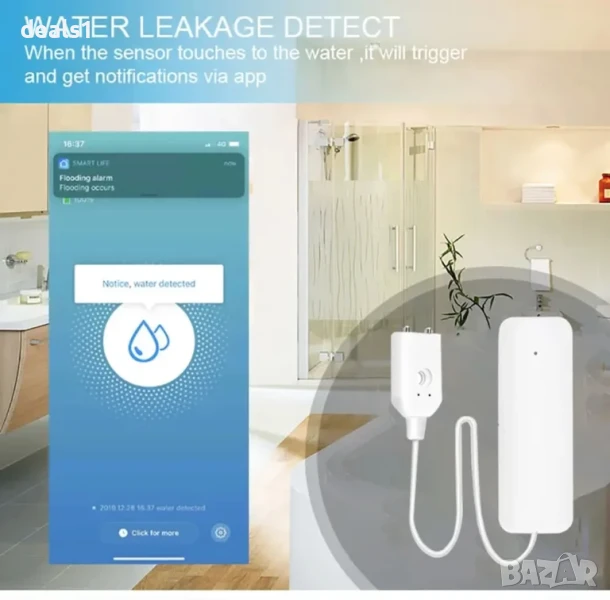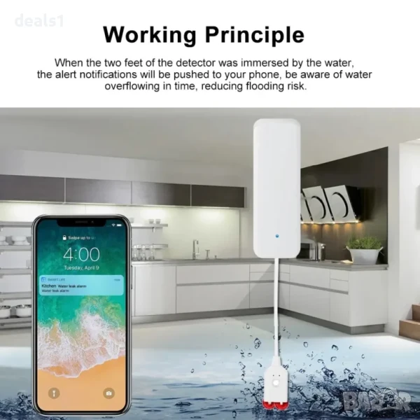 Подходящ за различни домашни ситуации: забравен кран, спукани тръби, разлята вода от аквариум, теч в кухнята, домашни любимци, които играят с вода. При открит теч устройството веднага задейства аларма, мига със светлина и изпраща известие на телефона чрез приложението. След отстраняване на водата алармата се изключва автоматично. Сензорът е с дълъг живот на батерията (до 1 година в режим на готовност), а при ниско ниво на батерията се получава известие чрез приложението.