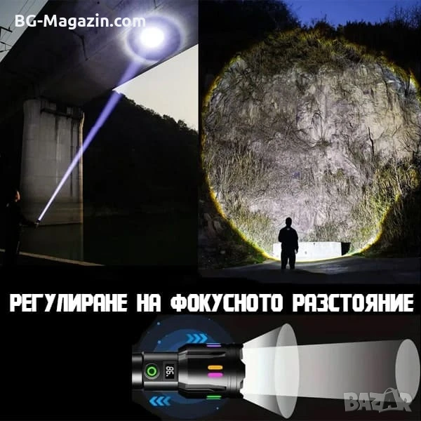 – Регулируем фокус: Позволява да се променя ширината на светлинния лъч според нуждите.