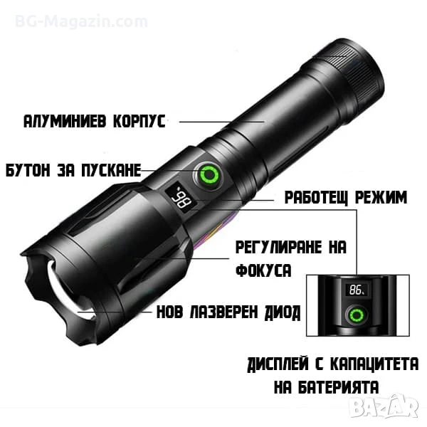 – Прецизен лазерен диод: Позволява точно насочване на светлината на големи разстояния.