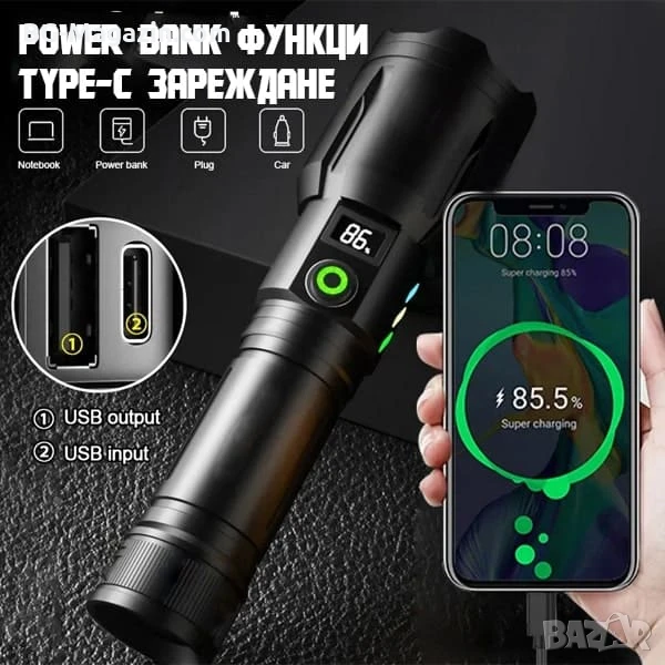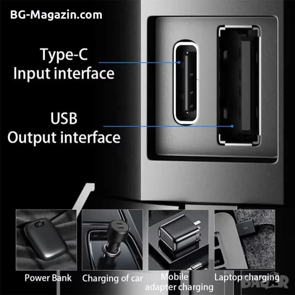 – Power Bank функция: Възможност за зареждане на телефони и други устройства.