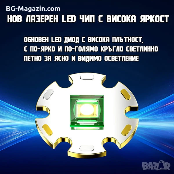 – Прецизен лазерен диод: Позволява точно насочване на светлината на големи разстояния.