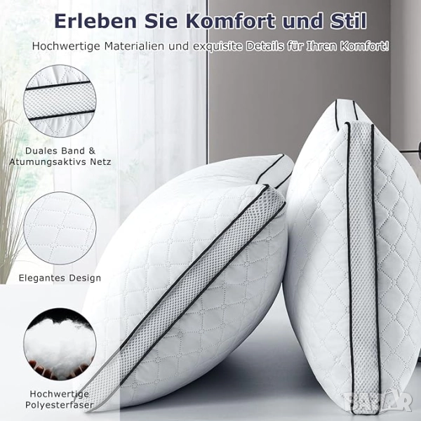 С елегантен дизайн и висококачествени материали, възглавниците са сертифицирани по Oeko-Tex Standard 100. Те са щадящи кожата и екологични, без мирис и вредни вещества - за да можете да спите спокойно и да дишате свободно през цялата нощ.